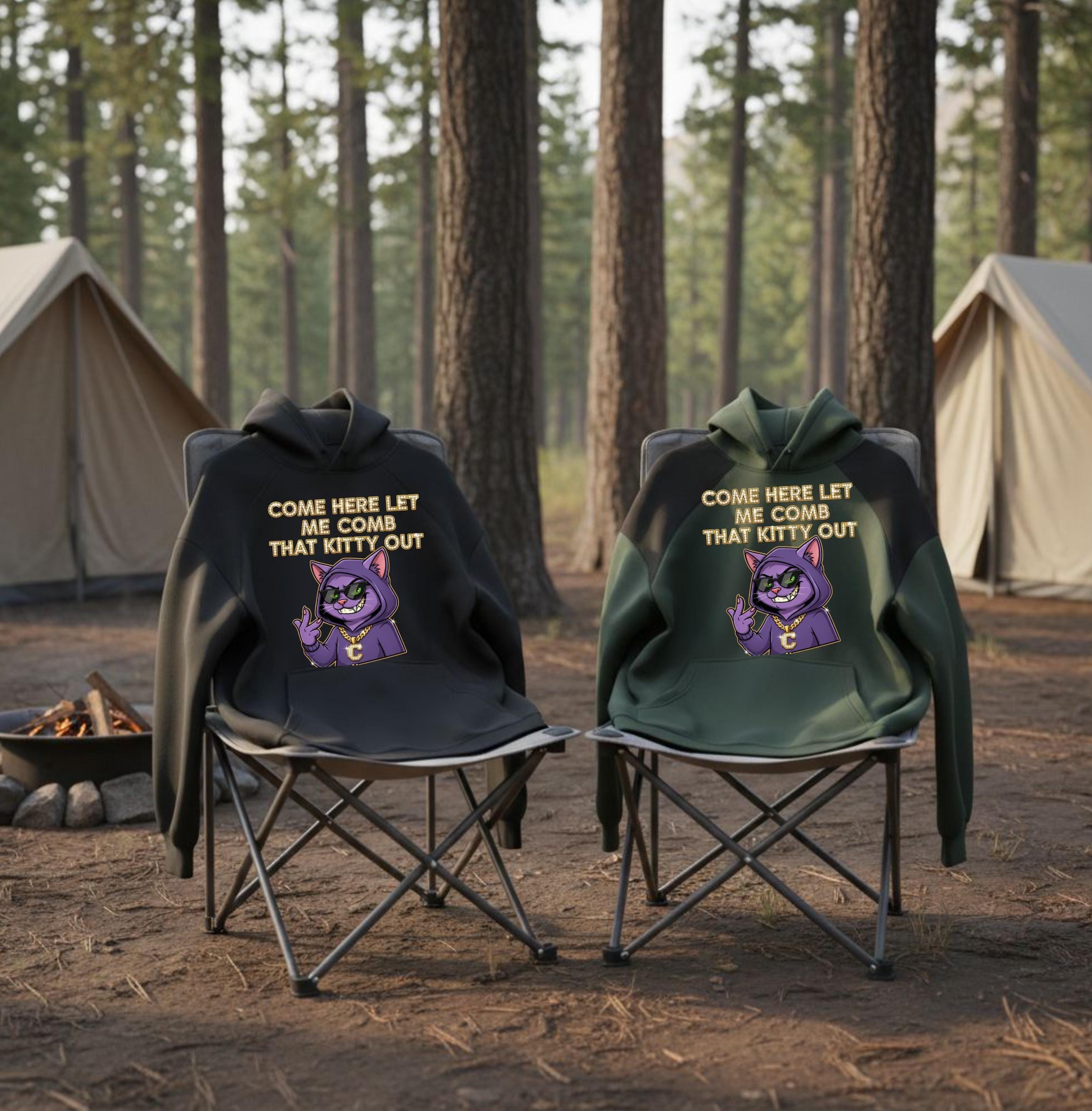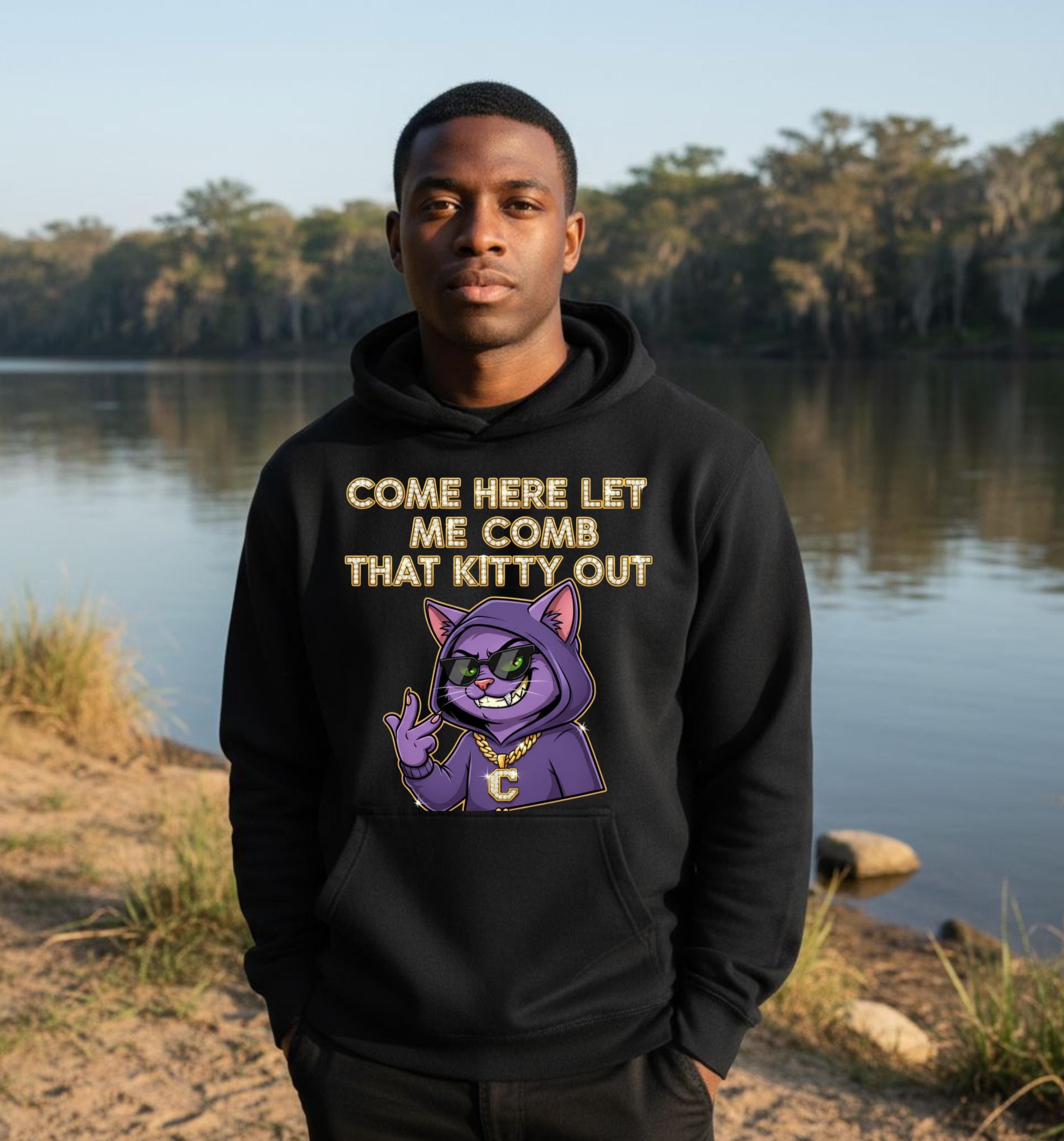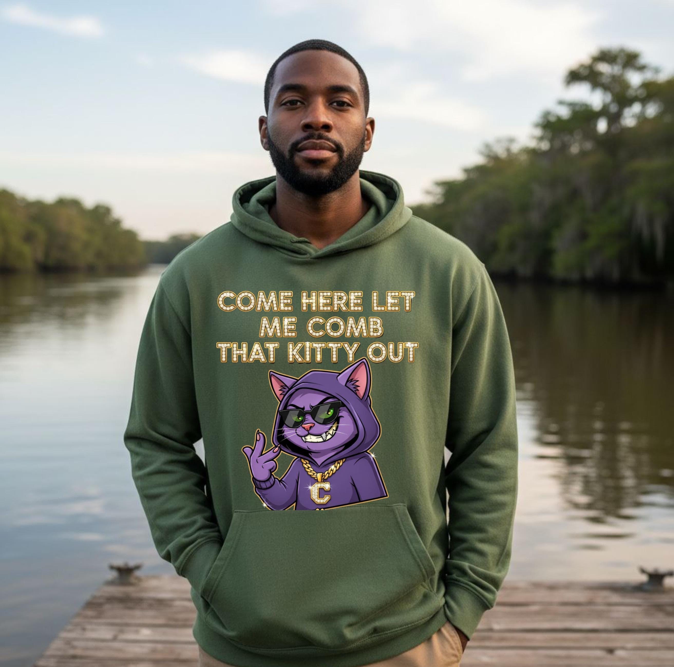 "Come Here Let Me Comb That Kitty Out" — a playful and edgy graphic tee featuring a bold purple cat in a hoodie, rocking a blinged-out chain and dark shaded glasses. This unique design blends streetwear style with attitude, making it a standout piece for those who love quirky fashion with personality. Perfect for casual wear, statement outfits, or gifting to someone with a bold sense of style.